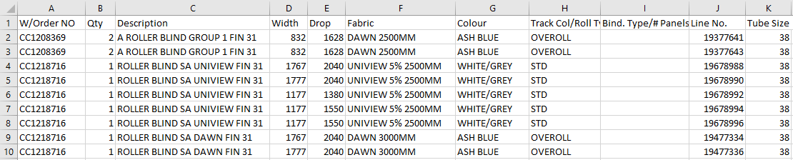 To load blinds into this system, use a spreadsheet with these 11 columns in this exact order.
